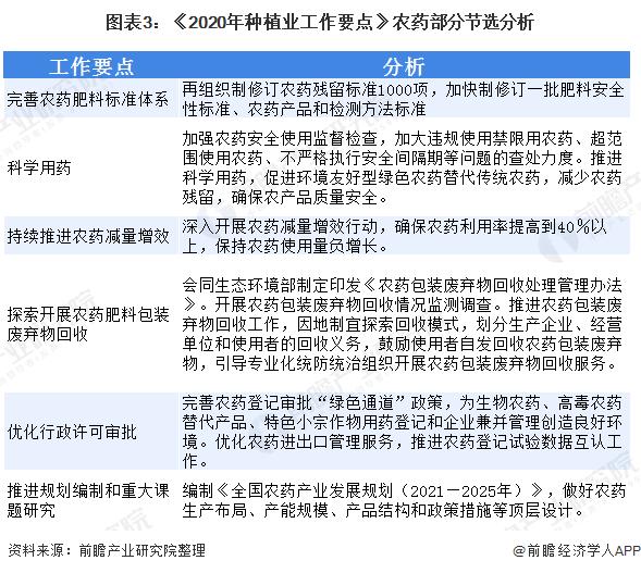 2020年2月6日农村农业部印发的《2020年种植业工作要点》中对农药行业的核心要点是确保农药利用率提高40%以上,其他工作要点包括对现有的农药残留制定标准、编制农药发展规划、印发农药包装废物回收办法、为生物农药和高毒农药替代产品开通“审批绿色通道”。