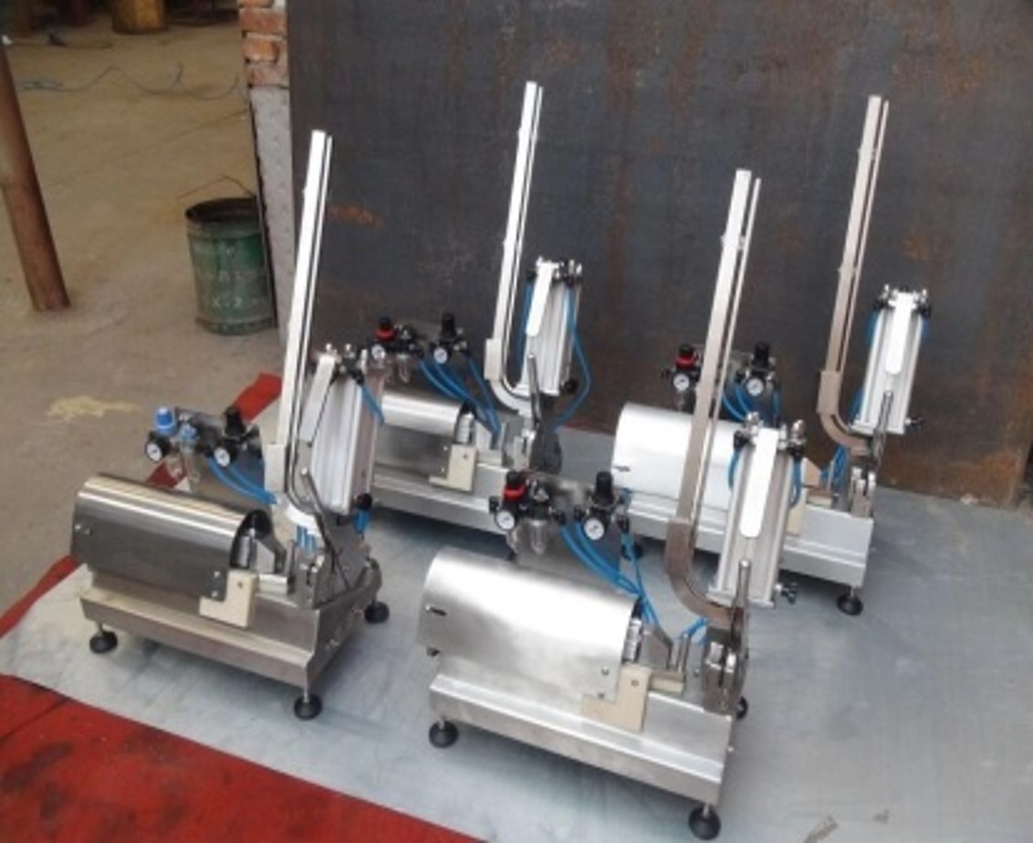 原理:产品预装后的包装膜被夹紧气缸夹紧后,由拉伸气缸把肠衣拉紧至要求,即可打卡封口及切断。
