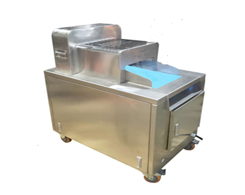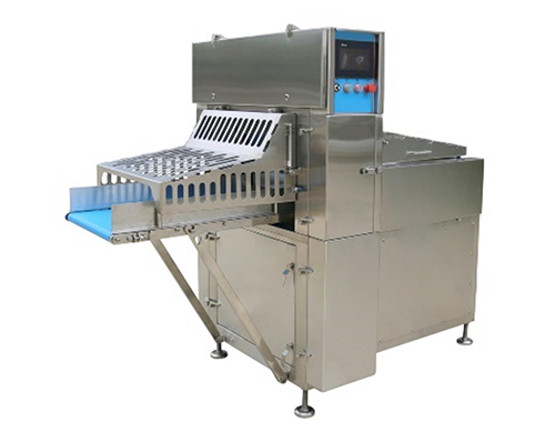原理:排骨切块机是带骨类切块切片的机台,通过链板传送,刀组切割,完成带骨类的切块操作