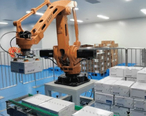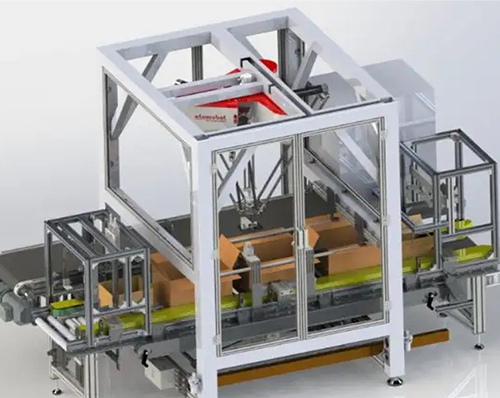 原理:抓取式装箱机将传送带上杂乱无序的包装物,按照一定的排列方式装入箱子的自动化设备。然后通过输送带将箱子传输至后续的码垛设备。