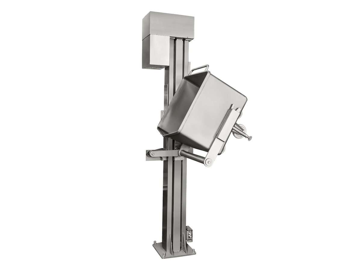 原理:提升机是以200L标准料车为配套,将物料提升到一定的高度后,倾倒至加工设备的料斗中,以完成加料工作。